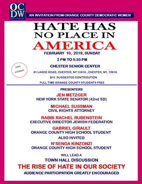 Anybody concerned about the rise in hate crimes and hate speech, anybody who has wondered what to do, would have found comfort Sunday afternoon at the Chester Senior Center. About 150 people listened to a panel discussing the role that hate plays today in America and talked to each other about the next steps. Just the need to have yet another panel discussion on this topic, the notion that hate is so prevalent in our nation and our region, is discouraging. But the crowd was larger than the organizers, the Orange County Democratic Women, had expected. So that was encouraging.